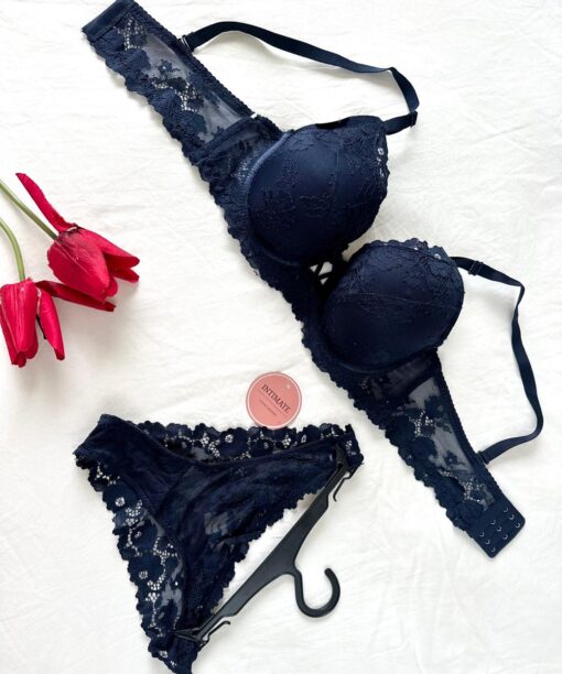 Soutien De Gorge et Culotte Dentelle Florale Bleu Nuit