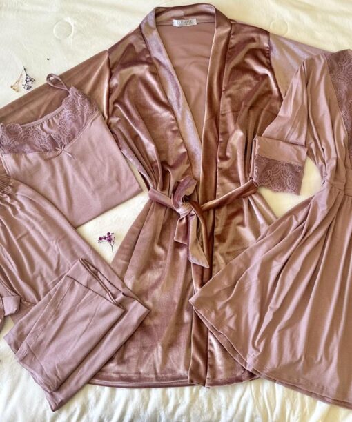 Pyjama 3 Pièces Velours Plissé Rose & Dentelle Noire