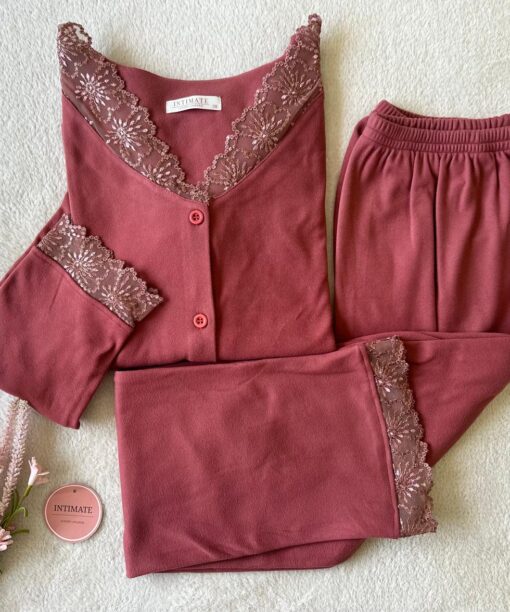 Pyjama 3 Pièces Velours Plissé Rose & Dentelle Noire