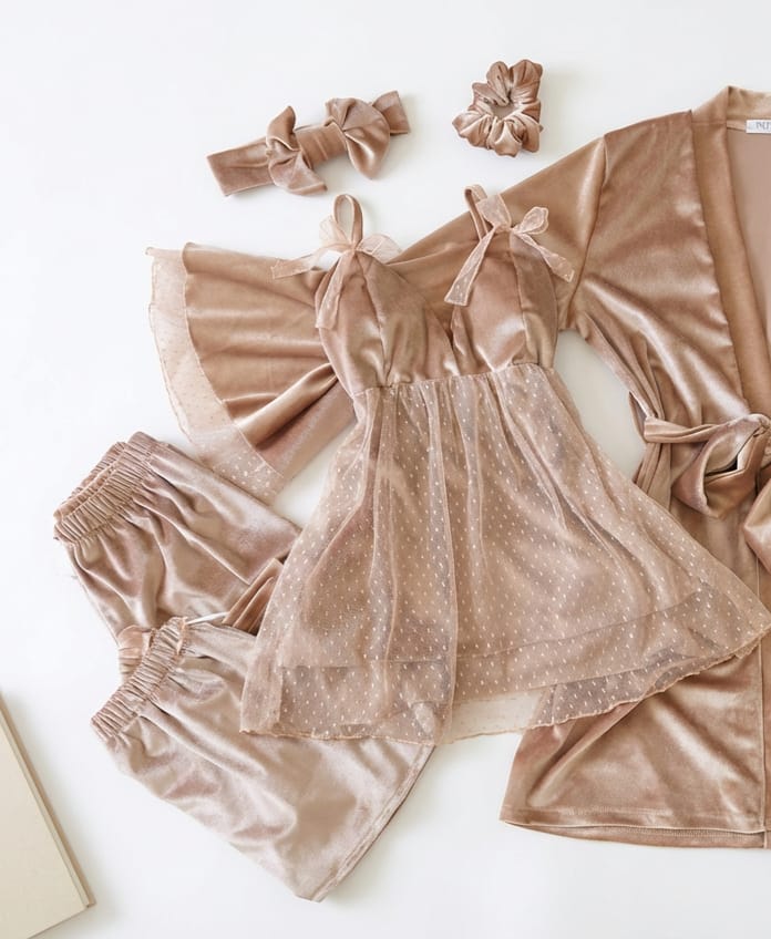 - Accessoires: une bandeau de cheveux avec un petit nœud et un chouchou.