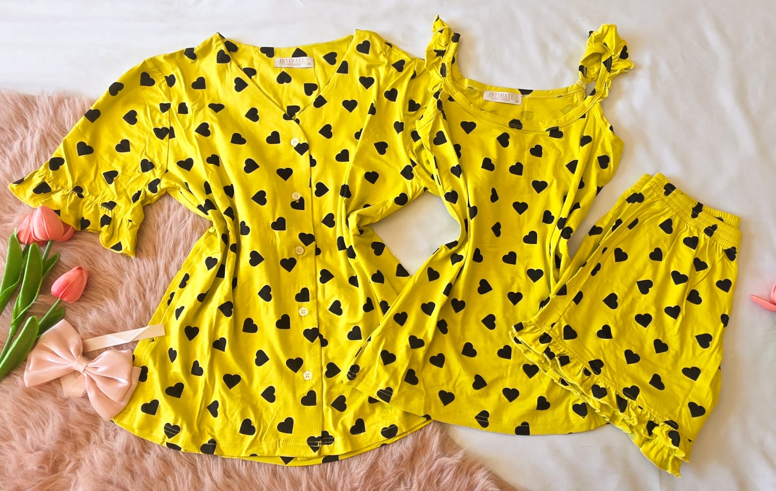 Pyjama 3 Pièces Coton Viscose Jaune Pointillé Cœurs Noirs