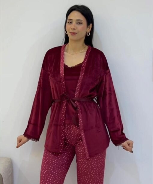 Pyjama 3 Pièces Velours Soft Rouge Bordeaux Pointillé