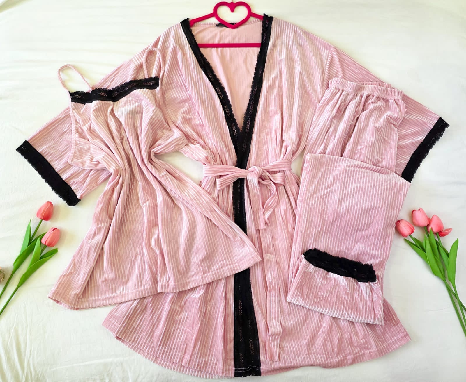 Pyjama 3 Pièces Velours Plissé Rose & Dentelle Noire