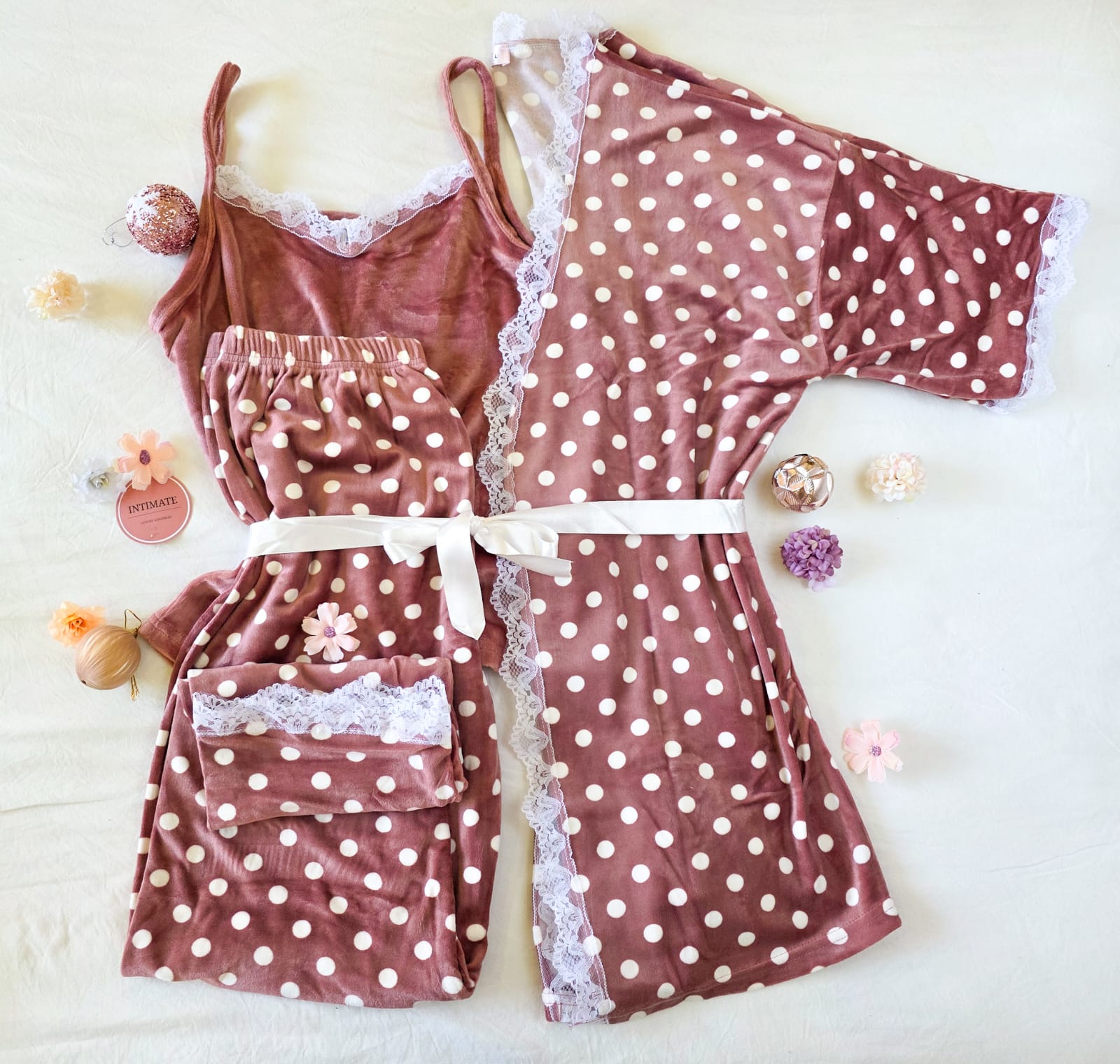 Pyjama 3 Pièces Velours Rose Pointillé Blanc
