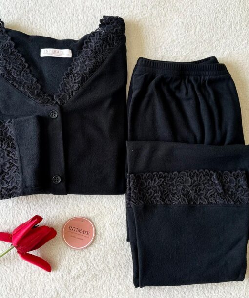 Pyjama Chemise Velours Soft & Dentelle Noir