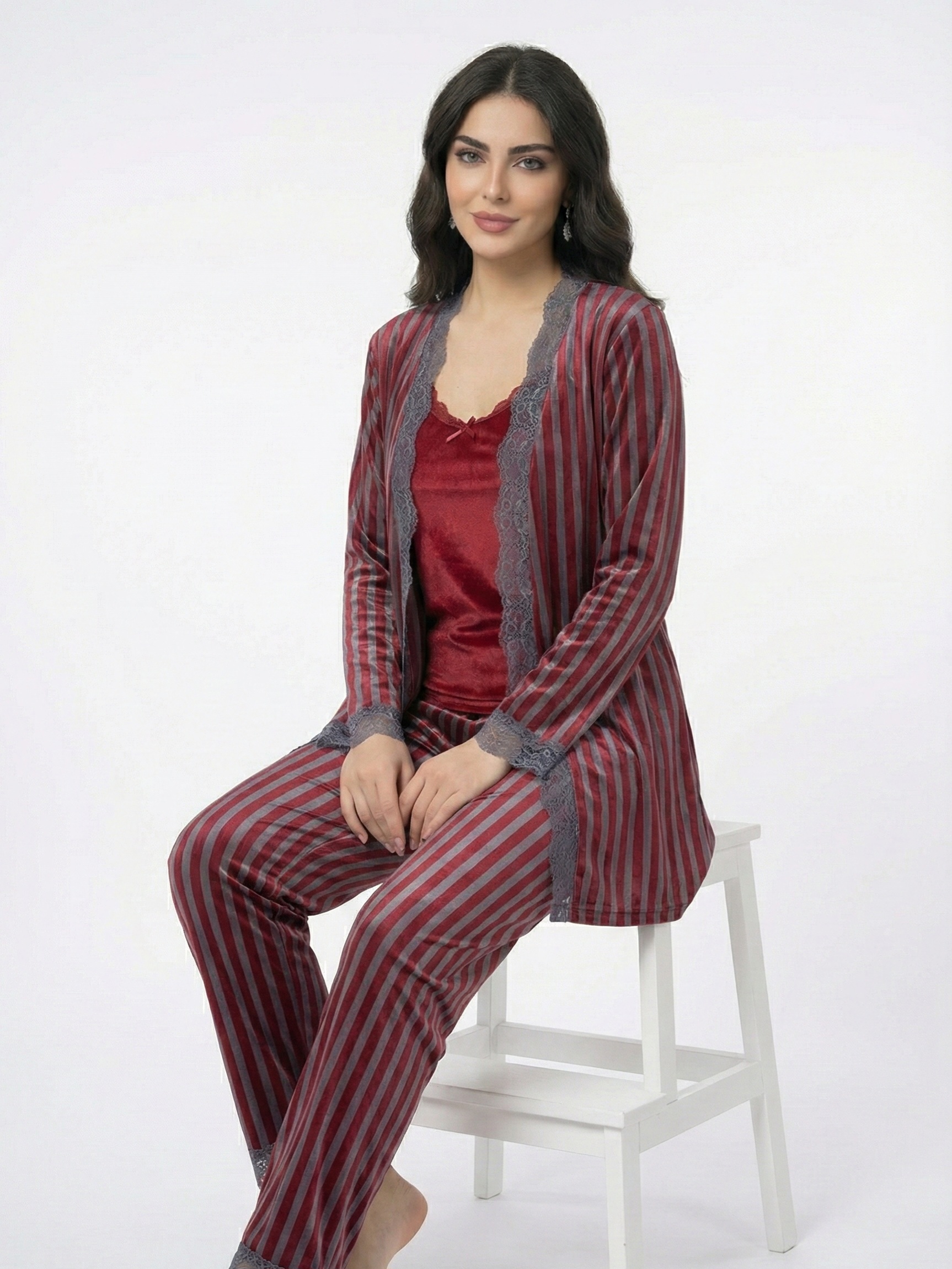 Pyjama 3 Pièces Velours Soft Rouge Gris Rayé